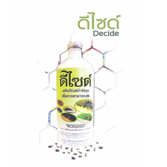 ขายส่ง น้ำยากำจัดยุงลาย ดีไซด์ (Decide) น้ำยาพ่นยุงสูตรผสม มีสรรพคุณในการกำจัดยุง,ยากำจัดแมลงบิน และแมลงคลานทุกชนิด โดยการฉีดพ่นด้วยการใช้เครื่องพ่นหมอกควัน หรือเครื่องพ่นละอองฝอย ได้รับการรับรองคุณภาพจากกระทรวงสาธารณสุข ว่าสารออกฤทธิ์ที่เป็นส่วนผสมในน้ำยานั้นมีประสิทธิภาพกำจัดยุงและแมลงบินได้ดี เพราะเป็นสูตรเฉพาะสำหรับพ่นหมอกควัน และพ่นฝอยละเอียด น้ำยากำจัดยุงลาย ดีไซด์ ออกฤทธิ์เฉียบพลัน สามารถกวาดล้างยุง และแมลงบินได้อย่างรวดเร็ว ปลอดภัย ไม่ส่งผลกระทบต่อมนุษย์และสิ่งแวดล้อม